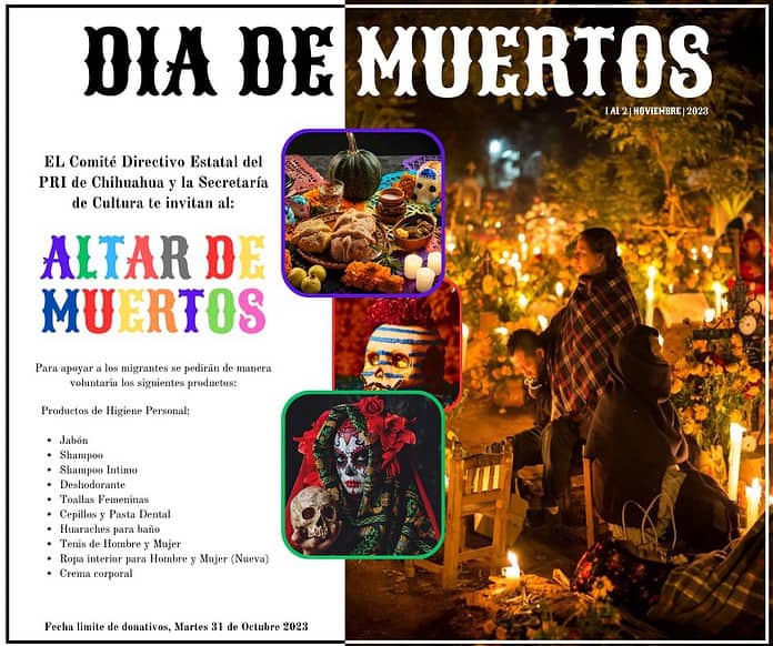 El Comite Directivo Estatal del PRI, invita a sus Militantes y Simpatizantes a visitar el Altar de muertos, el cual esta instalado en el loby de las instalaciones del Comite Directivo Estatal, acude y realiza tu donacion con articulos de higiene personal, los cuales se daran en apoyo a los albergues donde se encuentran los migrantes que van de paso por la ciudad de Chihuahua.