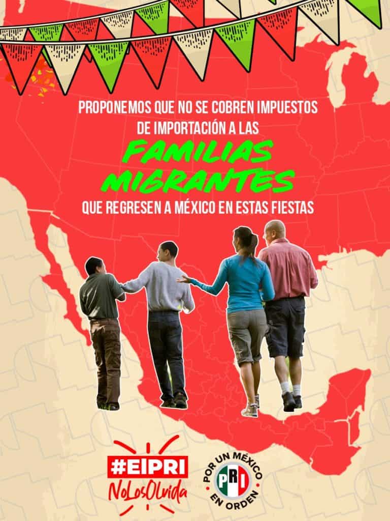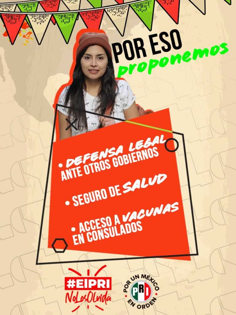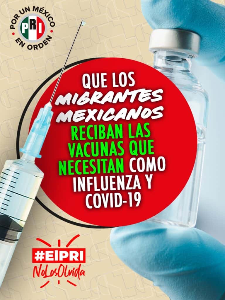 En el marco de una campaña con el hashtag #ElPRINoLosOlvida, para mejorar las condiciones de vida de los migrantes mexicanos, el Revolucionario Institucional, encabezado por Alejandro Moreno, propuso que se les apoye con acceso a seguro médico y vacunas en consulados, cuando lo necesiten, como es el caso para la influenza y el Covid-19.