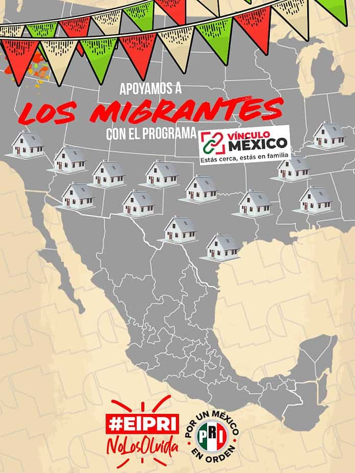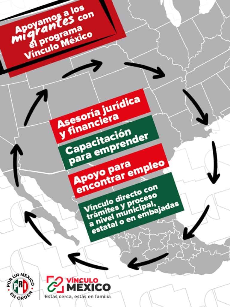En sus redes sociales, el partido tricolor afirmó que es el único en México que da asesoría jurídica y financiera, capacitación para emprender, y vínculo directo con trámites y proceso a nivel municipal y estatal, a este sector, a través del programa Vínculo Migrante, que opera a través de la Secretaría de Asuntos Migratorios del CEN del PRI; además de asegurar su participación política en su Consejo Político Nacional.