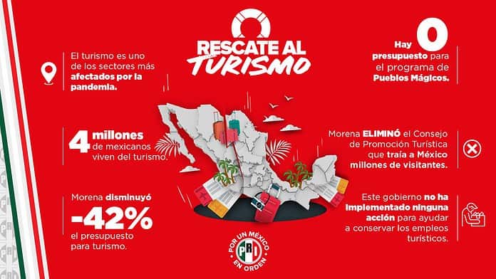 - El PRI Nacional indicó que ha sido una de las actividades más castigadas por la pandemia, pero además el gobierno de Morena disminuyó en un 42% su presupuesto y se eliminó el Consejo Nacional de Promoción Turística.