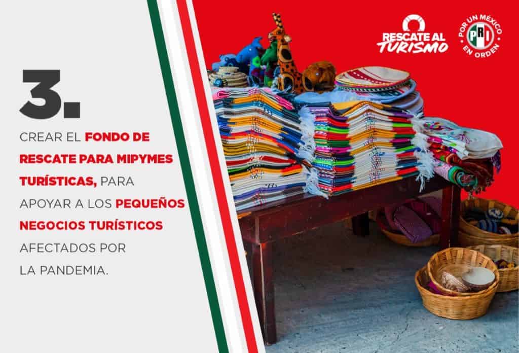 3. Crear el Fondo de Rescate de para Mipymes Turísticas. Miles de pequeños negocios que dependían del turismo se vieron gravemente afectados por la pandemia. Para apoyarlos e impulsar su participación en la reactivación económica, en el PRI proponemos crear el Fondo de Rescate para Mipymes Turísticas.
