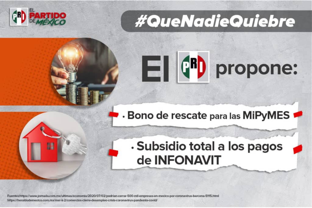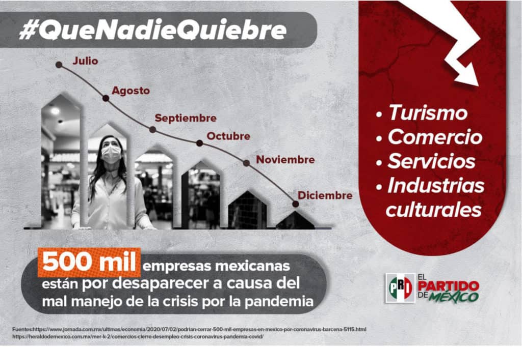 En un mensaje en sus redes sociales, con el Hashtag #QueNadieQuiebre, el PRI subrayó que la Comisión Económica para América Latina estima que 500 mil empresas desaparecerán por la crisis económica.