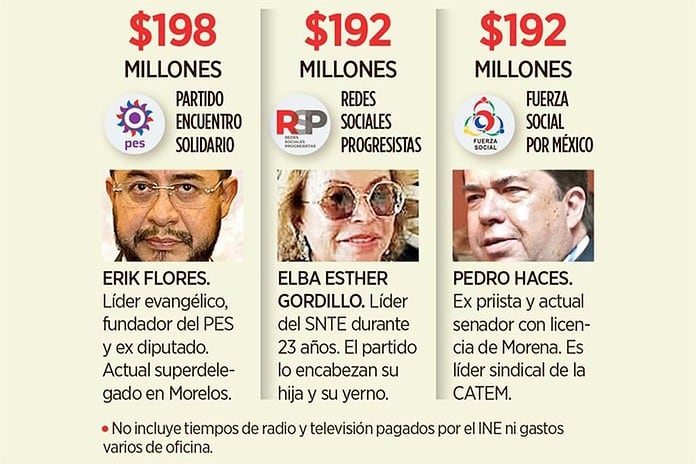 Ciudad de México.– Cada uno de los tres nuevos partidos políticos que contenderán en 2021, recibirán a partir de hoy unos 200 millones de pesos para sus actividades; además, el INE les pagará el salario de sus representantes, sus tiempos de propaganda en radio y televisión, oficinas y hasta artículos de limpieza y suscripciones a periódicos y revistas.