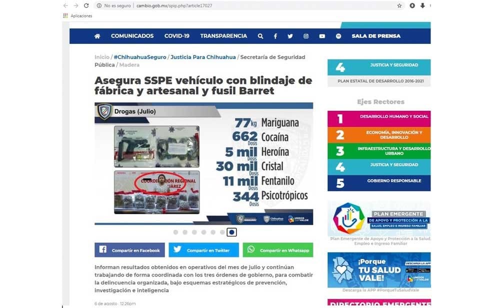 Pero un caso especial de un presunto detenido –cuya imagen presentamos en la edición digital de La Columna, tomada del portal oficial de Gobierno del Estado– sobresalió entre todos. Se trata de una persona capturada por la Coordinación Regional Juárez a la que curiosamente no le pusieron la cintilla negra con la que se protege el rostro de los acusados de algún delito.