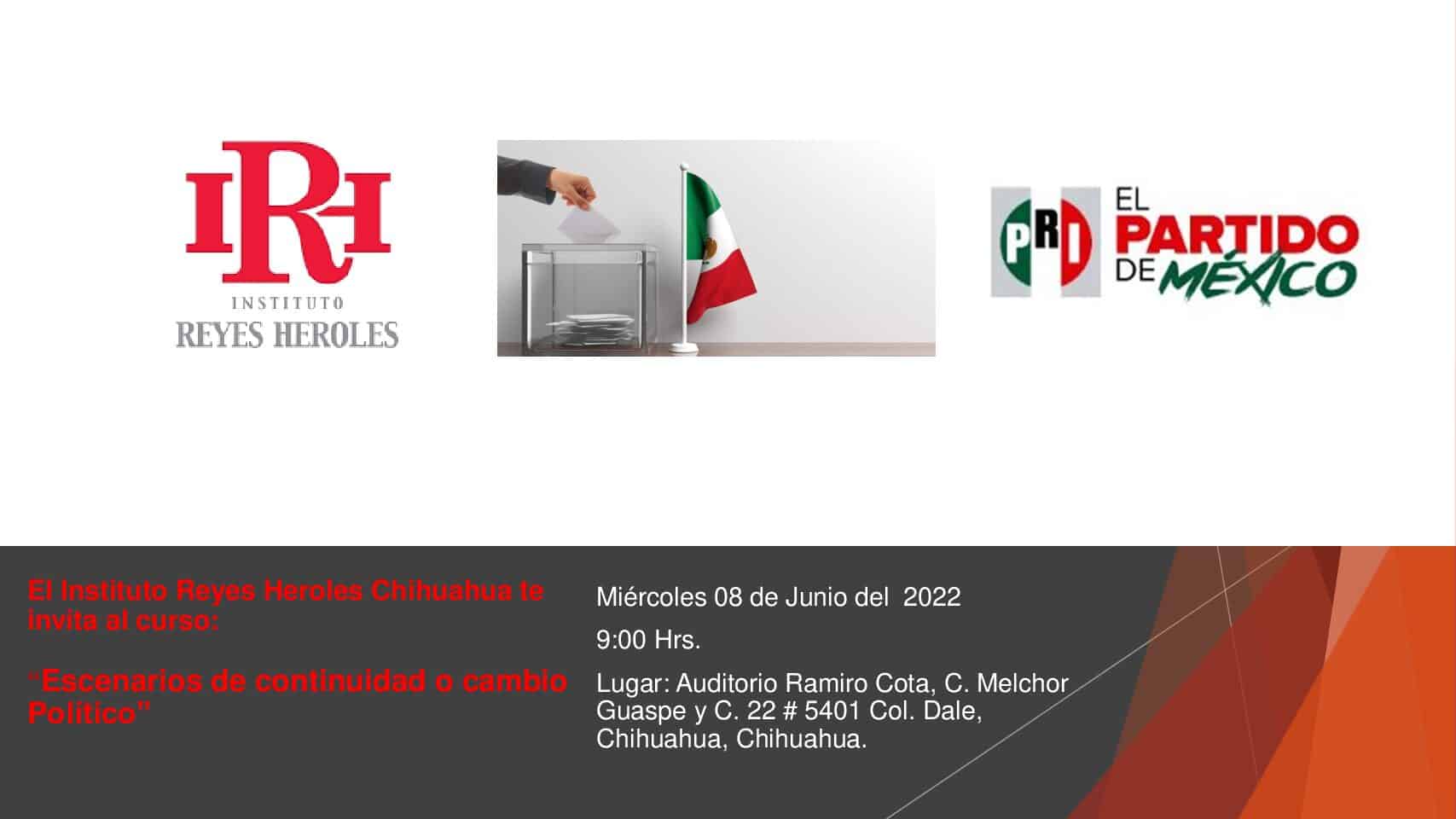El Instituto Reyes Heroles invita a todos los simpatizantes y militantes priístas al curso: “Escenarios de continuidad o cambio Político”, el cual será impartido el día 08 de Junio del 2022 a las 09:00 hrs. En el auditorio “Ramiro Cota”, del Comité Directivo Estatal del P.R.I.