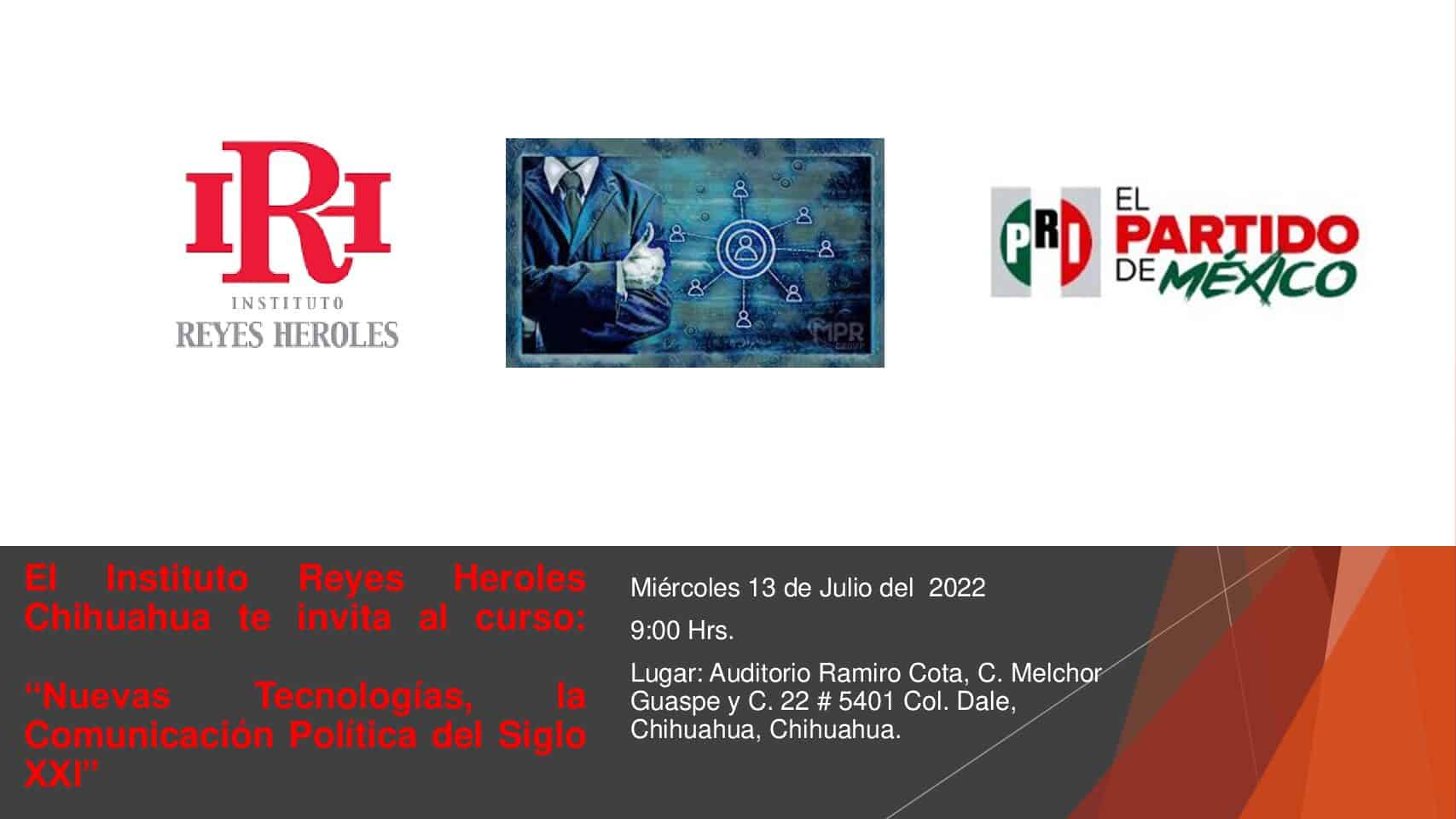 El Instituto Reyes Heroles invita a todos los simpatizantes y militantes priístas al curso: “Nuevas Tecnologías, la Comunicación Política del Siglo XXI”, el cual será impartido el día 13 de Julio del 2022 a las 09:00 hrs. En el auditorio “Ramiro Cota”, del Comité Directivo Estatal del P.R.I