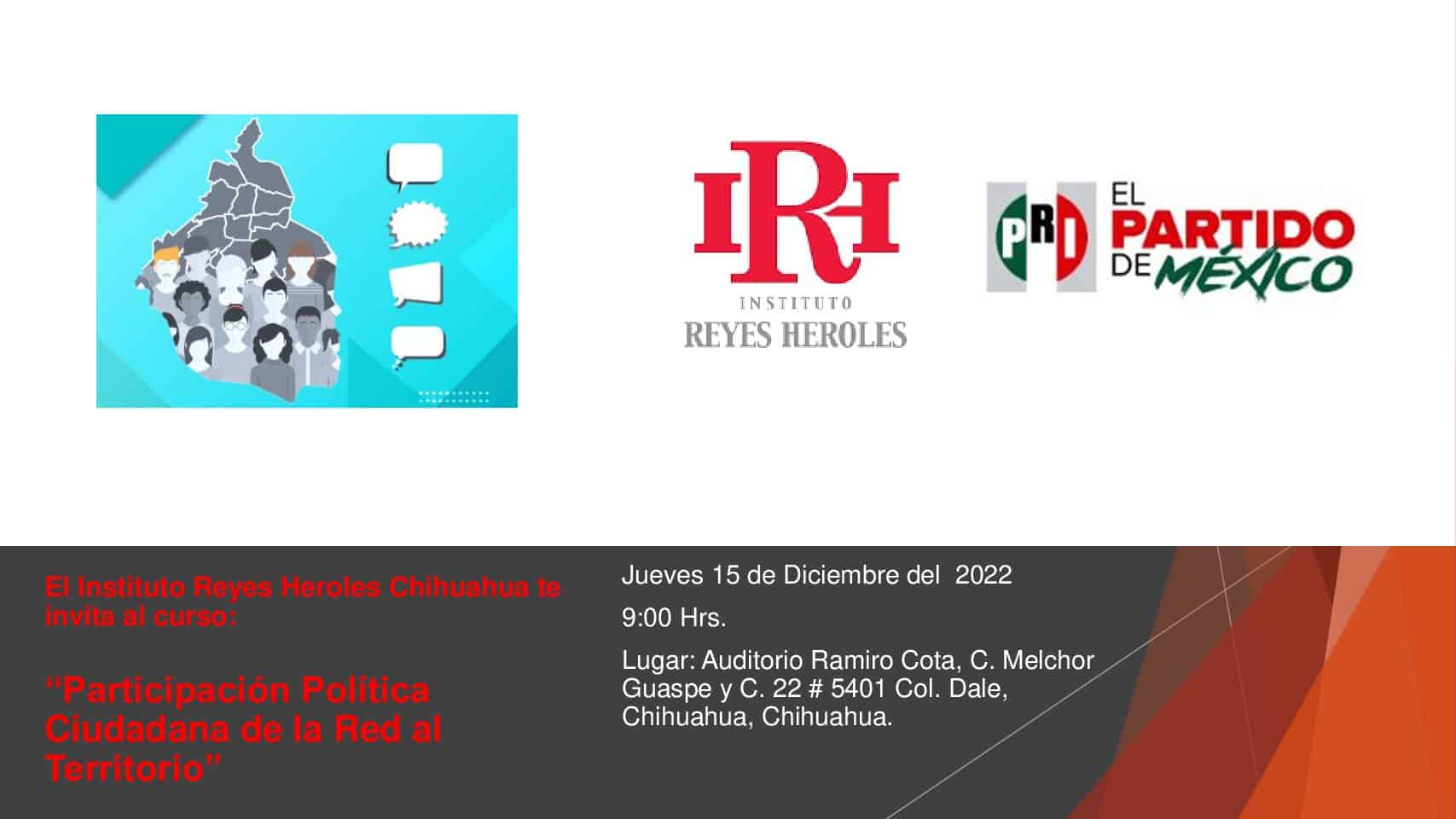 Inicio Sectores El Instituto Reyes Heroles invita a todos los simpatizantes y militantes priístas... El Instituto Reyes Heroles invita a todos los simpatizantes y militantes priístas al curso: “Participación Política Ciudadana de la Red al Territorio”, el cual será impartido el día 15 de Diciembre del 2022 a las 09:00 hrs. En el auditorio “Ramiro Cota”, del Comité Directivo Estatal del P.R.I.