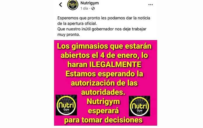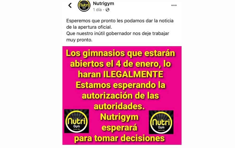 “Los gimnasios que estarán abiertos el 4 de enero, lo harán ilegalmente. Estamos esperando la autorización de las autoridades. Nutrigym esperará para tomar decisiones”, señala la empresa en su red social tras dar el perfectamente bien merecido garrotazo a Javier Corral, el gobernador del estado.