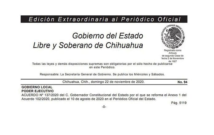 En letras mayúsculas dice “Gobierno local, Poder Ejecutivo, Acuerdo Nº 137/2020 del C. Gobernador Constitucional del Estado por el que se reforma el Anexo 1 del Acuerdo 102/2020, publicado el 10 de agosto de 2020 en el Periódico Oficial del Estado. Pág. 5119”.