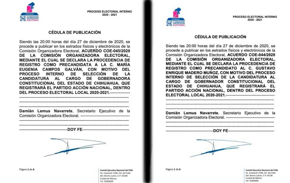 A través de su sitio oficial el organismo panista público los oficios en los que destaca la procedencia del registro del senador con licencia, Gustavo Madero, así como de la alcaldesa de Chihuahua, Maru Campos.