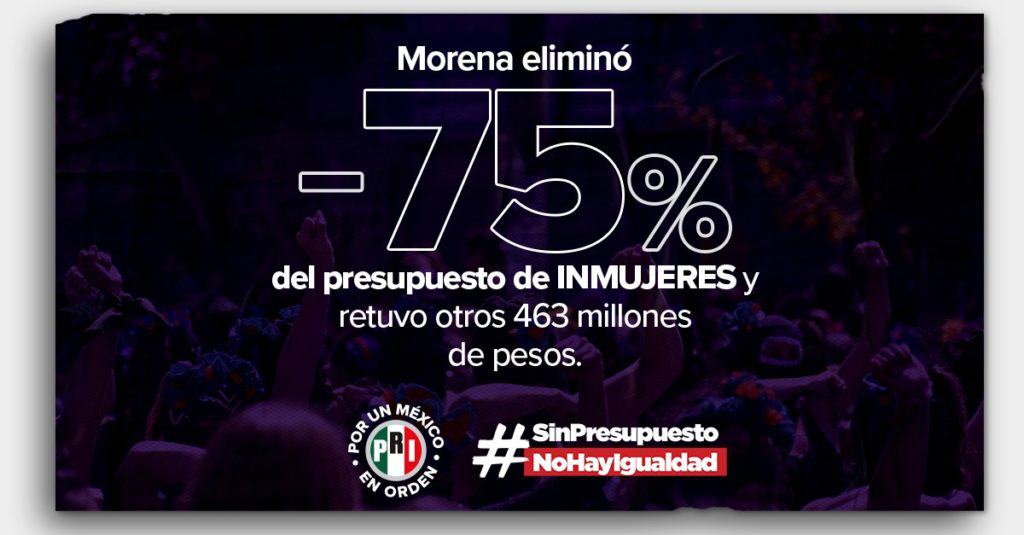 La dirigencia del tricolor, encabezada por Alejandro Moreno y Carolina Viggiano sostuvo que eliminar el 75% del presupuesto del Instituto Nacional de las Mujeres (INMUJERES) es una terrible violación a la Ley Federal de Presupuesto y Responsabilidad Hacendaria por parte del gobierno federal.