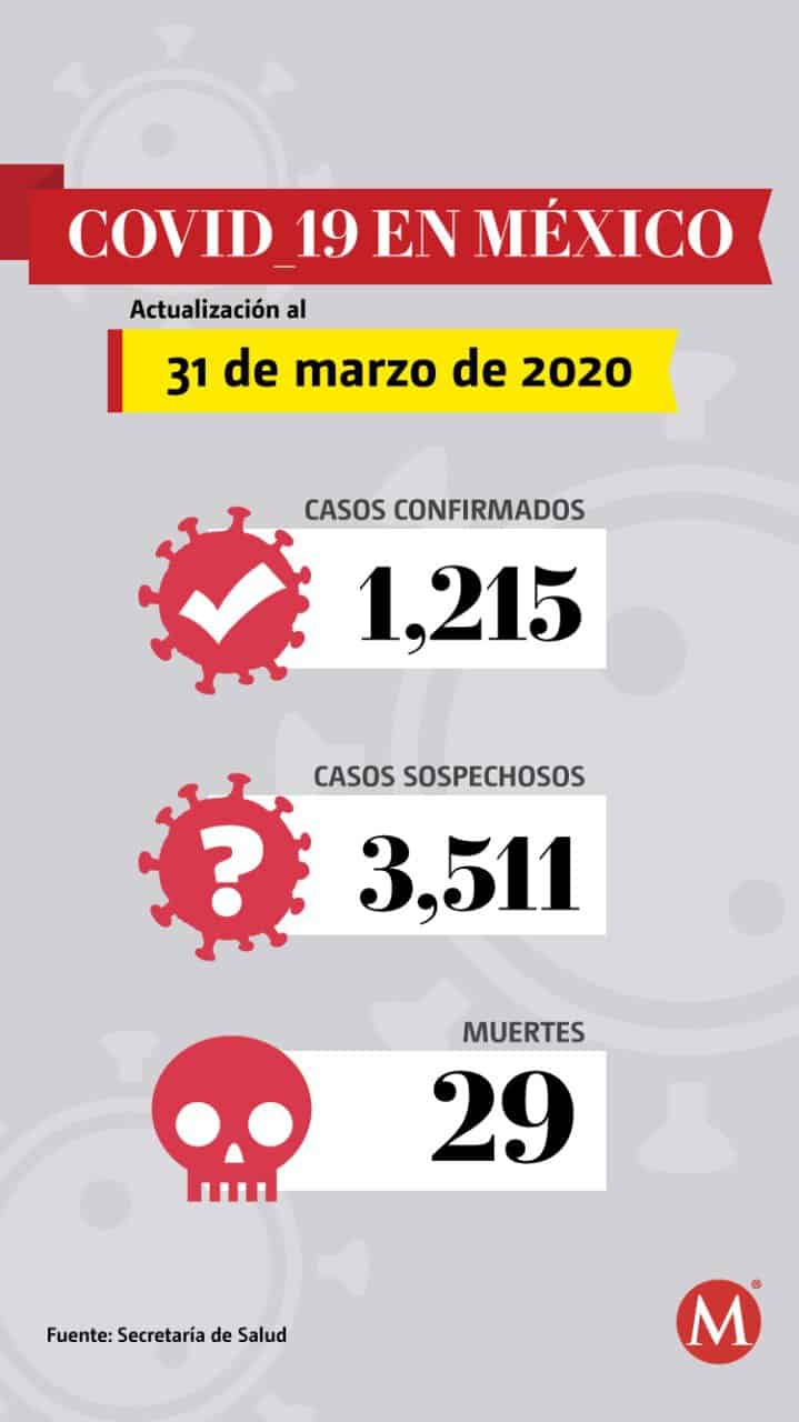 José Luis Alomía, director general de Epidemiología, dio a conocer este martes que ya son 29 los decesos por Covid-19 en México, y señaló que hay mil 215 casos confirmados en el territorio nacional.